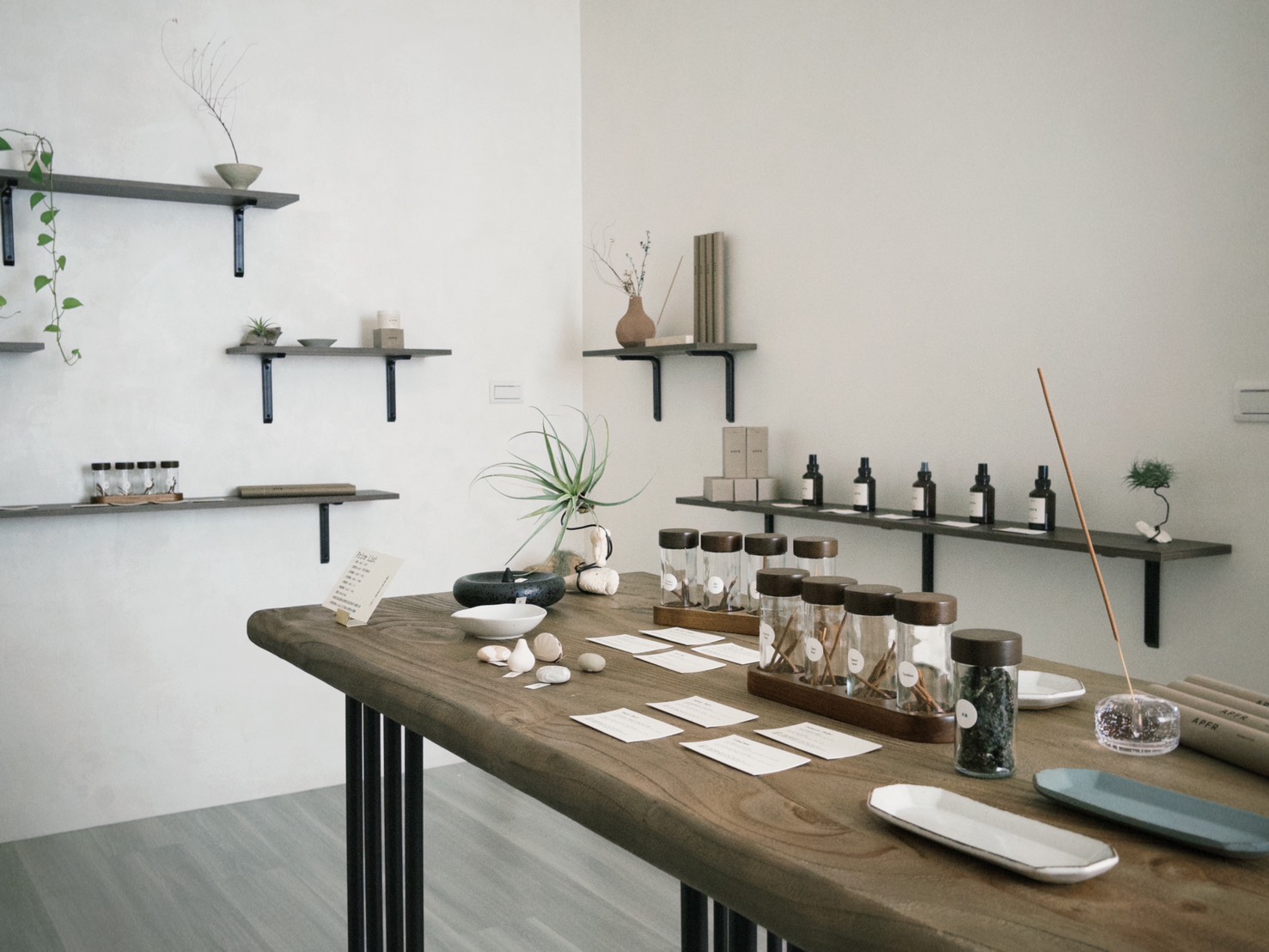 而二樓,則是另一個層次的寧靜體驗。宅意JAII TEA最近開設了二樓選品藝廊 Object Gallery,與APFR香氛品牌合作。踏上樓梯,迎面而來的是淡淡的木質香氣,與精緻的香氛微微交織,緩緩流淌在空間裡。陽光透過窗戶灑落,光線彷彿被有意引導,輕柔落在每件陳列的小物上,細膩的質感在光影中閃爍,讓人自然而然放慢呼吸,靜靜欣賞每一個細節。沉穩的布置與自然香氣交織,像是為日常打造了一個短暫的停泊之地,每一步都帶著溫暖與寧靜。