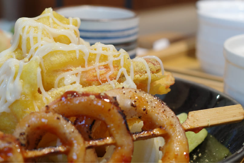 再端上桌的「金沙旺來鮮菓蝦球」則展現創意台菜的巧思,比一般鳳梨蝦球更有層次,除鳳梨的酸甜,還加入芭樂的清爽果香,每一口都讓味覺多了驚喜。金黃酥脆的外層包裹鮮嫩蝦仁,再搭配烤花枝串,口感彈牙,鹹香交織果香,讓人忍不住一口接一口。
