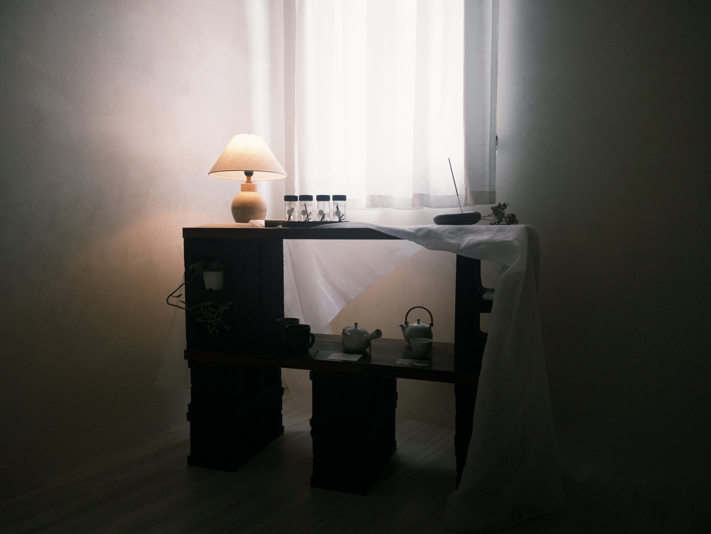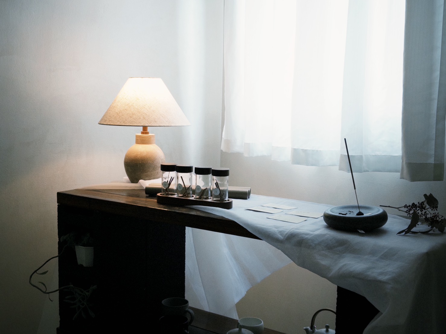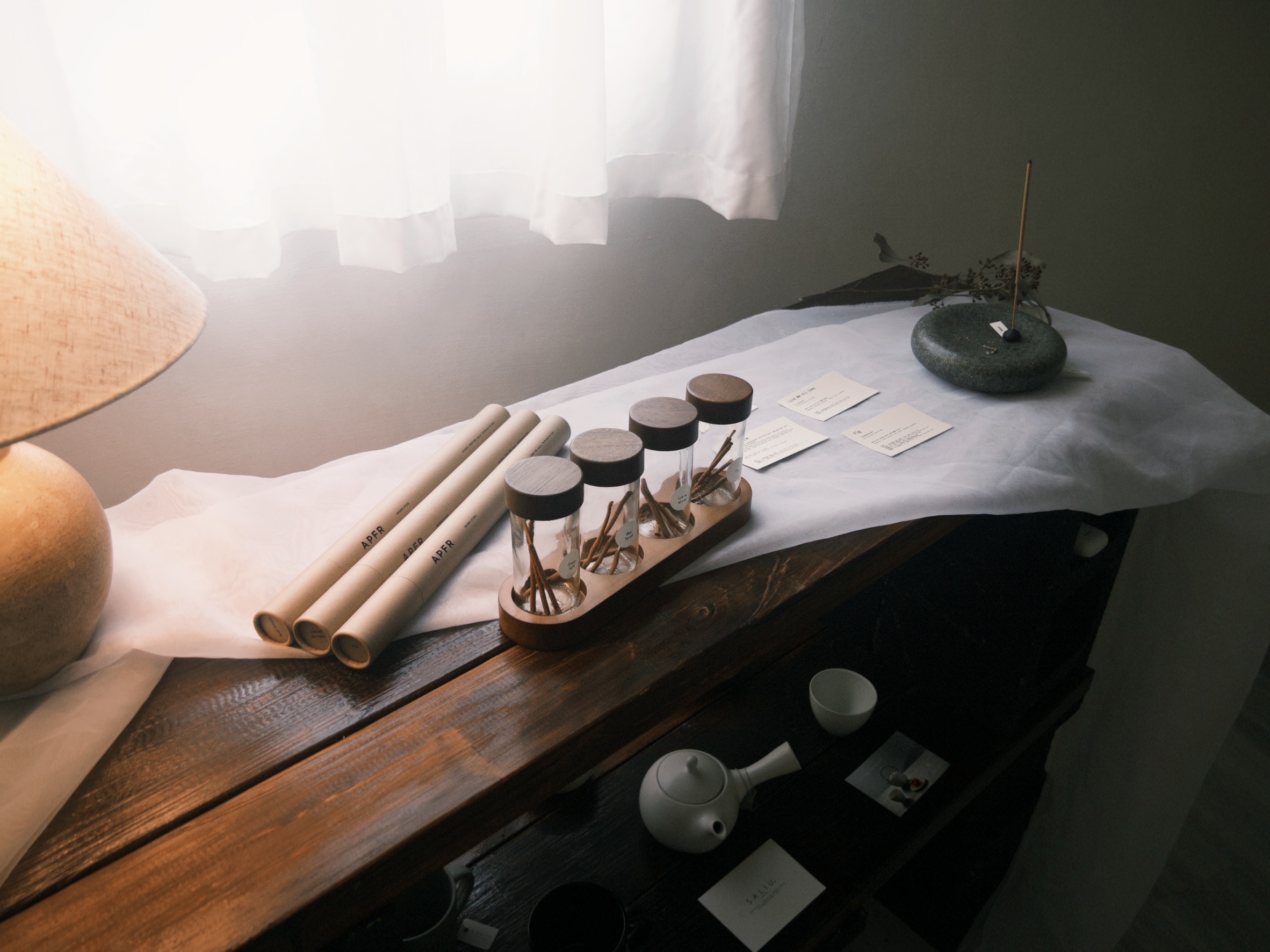 而二樓,則是另一個層次的寧靜體驗。宅意JAII TEA最近開設了二樓選品藝廊 Object Gallery,與APFR香氛品牌合作。踏上樓梯,迎面而來的是淡淡的木質香氣,與精緻的香氛微微交織,緩緩流淌在空間裡。陽光透過窗戶灑落,光線彷彿被有意引導,輕柔落在每件陳列的小物上,細膩的質感在光影中閃爍,讓人自然而然放慢呼吸,靜靜欣賞每一個細節。沉穩的布置與自然香氣交織,像是為日常打造了一個短暫的停泊之地,每一步都帶著溫暖與寧靜。