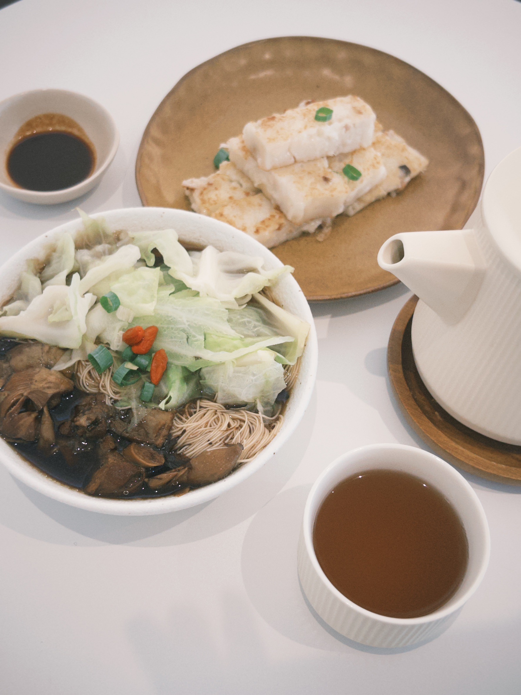 走進宅意JAII TEA,首先映入眼簾的是極簡的白色系裝潢,空間寬敞明亮,光線透過大片窗戶灑落,像柔和的畫筆,把空氣也染得清新透亮。坐在窗邊,一份招牌蘿蔔糕和期間限定的鹹食餐點放在面前,隨著茶香徐徐升起,食物的細膩滋味在舌尖散開,彷彿日常的喧囂都被暫時放下。每一口都是舒緩,也是一種生活的儀式感。